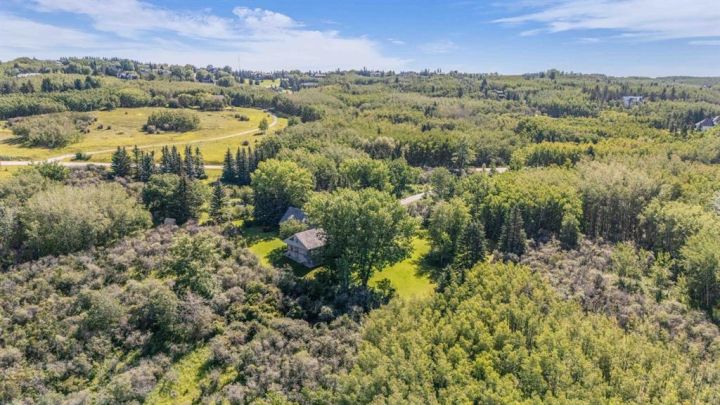 Room to breathe, every once in a while, an extremely RARE 20-Acre Ridge top legacy estate with SWEEPING Rocky Mountain Views comes available. Experience an unparalleled blend of natural beauty, privacy, and potential with this exceptional 20-acre property perched high on the ridge along prestigious Escarpment Drive in Lower Springbank. Offering uninterrupted, PANORAMIC views of the majestic Rocky Mountains, from this one owner occupied property. This timeless ARCHITECTURAL masterpiece, spans over 6,600 sq. ft. and is surrounded by mature trees, a tranquil pond and seasonable stream, and thoughtfully designed outdoor living spaces—each perfectly positioned to capture the awe-inspiring views while maintaining complete seclusion. Inside, the vaulted foyer opens to a stunning great room with floor-to-ceiling windows framing the Rockies. Warm terracotta tile and light oak hardwood flow through the main level. The spacious formal dining room, with its elegant tray ceiling, while the SUNLIT updated kitchen features premium appliances, granite counters, a spacious dining area with full-height windows, and a generous butler’s pantry for effortless entertaining. Outstanding owner’s retreat offers a serene escape with a mountain-facing primary bedroom, luxurious 5-piece ensuite, walk-in closet, and an adjoining office or sitting room with a gas fireplace and expansive windows. The WALKOUT lower level is designed for comfort and hospitality, featuring three large bedrooms (one with ensuite), a 4-piece bath with steam shower and sauna, and a cozy family room with a fireplace built from rocks gathered on the property. French doors lead to a west-facing patio, the perfect spot to watch the sun set behind the mountains. The upper level offers even more flexibility: a lofted family room with a Spanish-style wood-burning fireplace, a bright skylit den, a hobby room, a 3-piece bath, and a full billiards room with an authentic snooker table. This property is TREED, and the private acreage is boundary fenced and brimming with potential and ripe for future development, equestrian pursuits, or simply preserving as untouched natural space. This ideal location is just 5 minutes to Calgary’s west side amenities and Stoney Trail, close to downtown, and Rocky Mountains, IRRECPLACEABLE location combines convenience with seclusion. It’s also close to some of Canada’s top-ranked public and private schools, making it an ideal choice for families seeking a premier lifestyle. Whether you’re a visionary looking for a once-in-a-lifetime investment or a discerning buyer seeking an extraordinary private estate, this property offers tons possibilities. This is more than a home—it’s a rare OPPORTUNITY to own a piece of Alberta’s most breathtaking landscapes and mountain views.