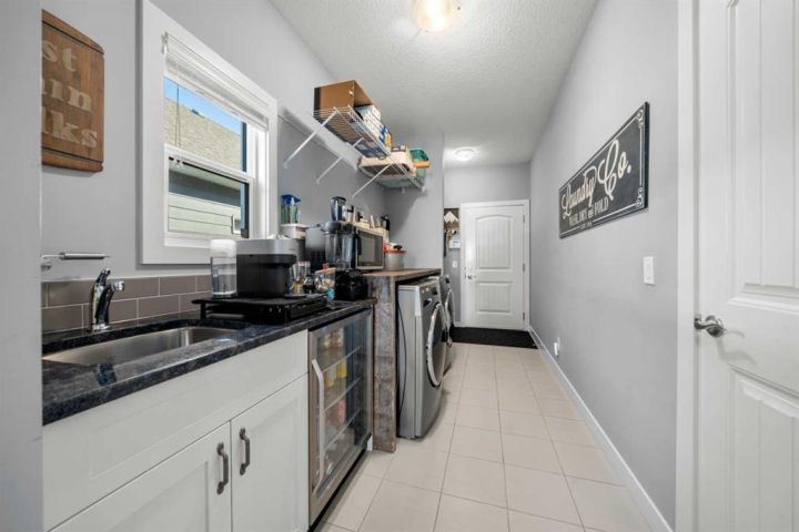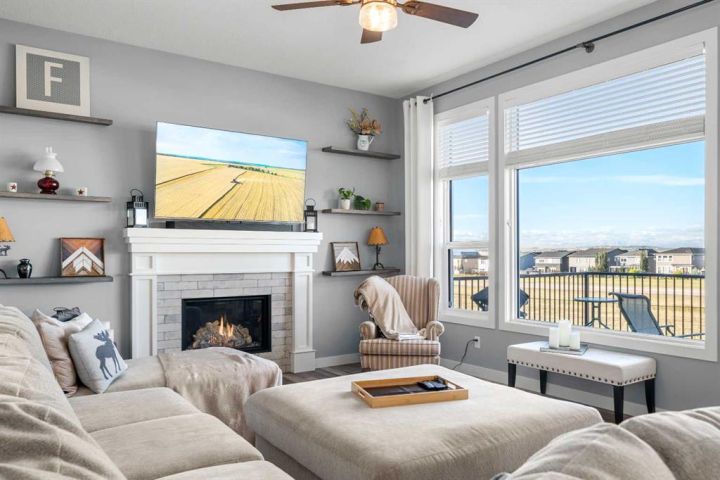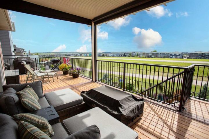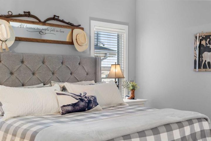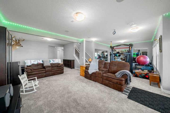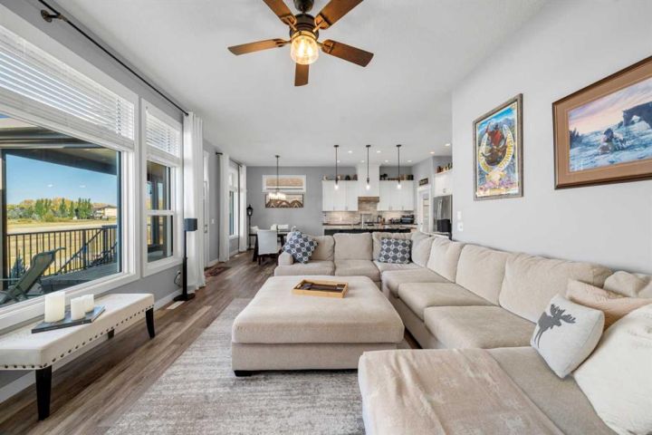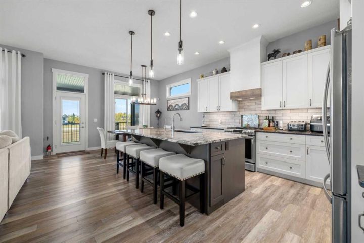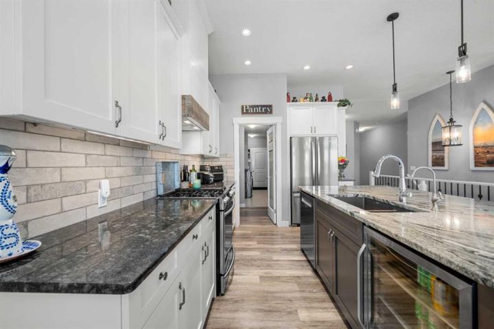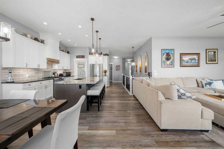 Gorgeous upgraded walkout 3 bedroom bungalow backing onto greenspace with great mountain views. This beautiful home has central air conditioning, epoxy flooring in a heated oversized garage, underground sprinklers, amazing landscaping, a full width deck with a gazebo and remote control screens, gemstone lighting and many other upgrades. As you drive up to the property you will love the low maintenance front yard and the great curb appeal on this home. Inside you will find beautiful LVP flooring, high ceilings and a fabulous layout. This home was designed to take full advantage of the west facing views, featuring huge windows throughout the back of the property, providing tons of natural light and allowing you a great view of our awesome sunsets. The spacious living room has a gas fireplace - making it a great place to relax after a long day! Entertain in the large dining room or step out side onto the massive deck and then you can choose whether to sit in the covered, screened area or be out in the open enjoying your BBQ! The kitchen is stunning and features a huge granite island with room for 4 bar stools, stainless steel appliances, including a gas stove, extended height white cabinets and a walkthrough pantry. The laundry room has a lovely barn wood counter above the washer and dryer, a sink with granite counter, drink fridge and a useful built in storage bench. The spacious master bedroom has a walk in closet and features a beautiful barn wood door leading to the 5 piece ensuite with large shower, soaker tub and dual sinks with granite counter. Completing this level is a half bathroom. In the fully finished walkout basement there is a large family/games room with built in speakers and lots of natural light from the large windows. There is a gym area with rubber flooring and mirrors - perfect for the fitness enthusiast or for a children's play area. There are 2 large bedrooms both with great sized closets and a 3 piece bathroom with a large shower. The furnace room has lots of storage with built in shelving. Did I mention this home has a water softener, a reverse osmosis system for your drinking water and gemstone lights both front and back? The yard has beautiful landscaping and includes a large concrete pad outside of the walkout basement, a paved patio area, a gravel firepit area, underground sprinklers and beautiful flower beds and trees. The 22x24ft heated garage features high ceilings, epoxy flooring, slat walls, tire rack and a bicycle pulley system - a garage to be proud of! This home is stunning and should be viewed to be appreciated! View 3D tour/Multi Media/virtual tour.