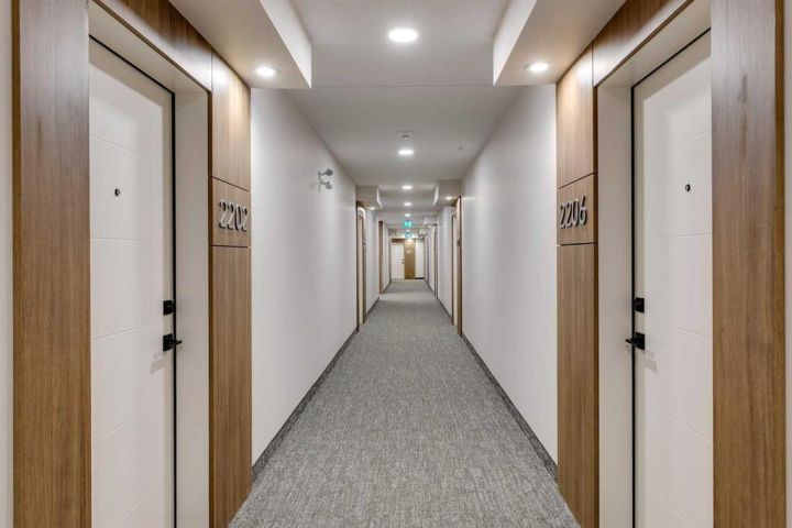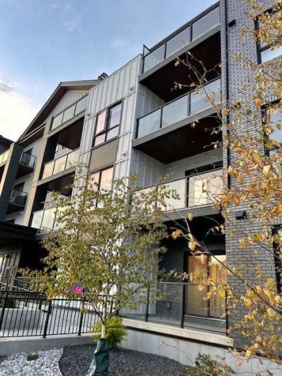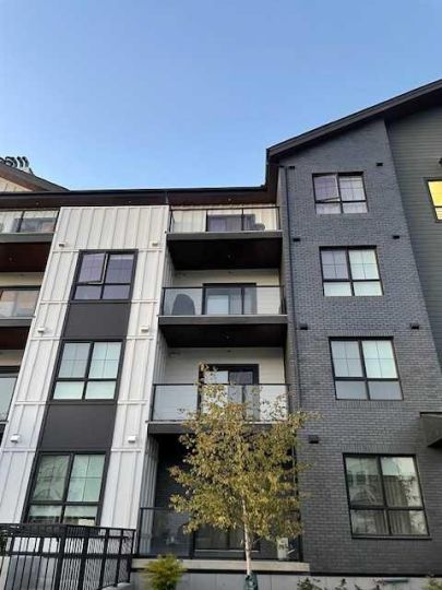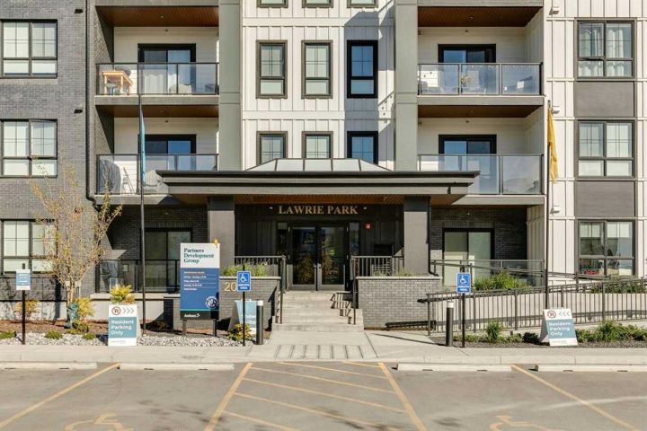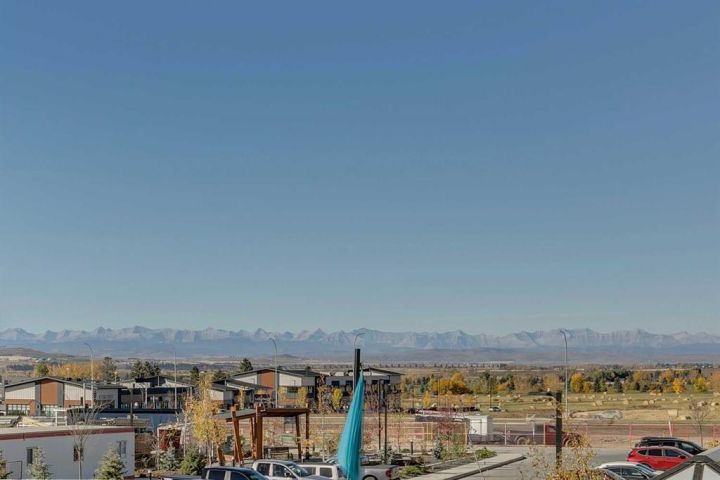 Welcome to the Lawrie Park, Okotoks' newest apartment complex, surrounded by parks, walking paths, and panoramic views. Enjoy the convenience of being within walking distance to D'Arcy Crossing Shopping Centre, as well as easy access to Calgary. This development, quality built by Partners Homes, offers a prime location with modern design and finishings. This is an ideal option for first time buyers, retirees, investors and young professionals. Functional floor plan with 2 bedroom, 2 bath unit has a sunny south exposure from the spacious private balcony (with gas barbeque hook-up). This second floor unit features an open floor plan with high ceilings, large windows, and bright interior colors. Upgrades include air conditioning, barn door, custom window coverings and more. The bright kitchen features white cabinets, quartz counters, and massive center island with huge dining/breakfast bar area. The adjoining living room offers an abundance of space for furnishings with patio door to enjoy the mountain, courtyard and park views. The master bedroom is a good size featuring a 4-piece ensuite. The second bedroom would also be ideal for a home office or flex room. There is a main 4-piece bathroom and convenient in-suite laundry. Titled heated underground parking and assigned storage locker. This is a pet friendly complex. Enjoy a relaxing stress-free lifestyle in this outstanding Lawrie Park condo. Immediate possession. Just move in and enjoy!