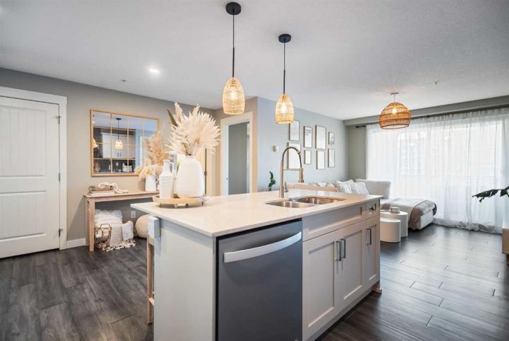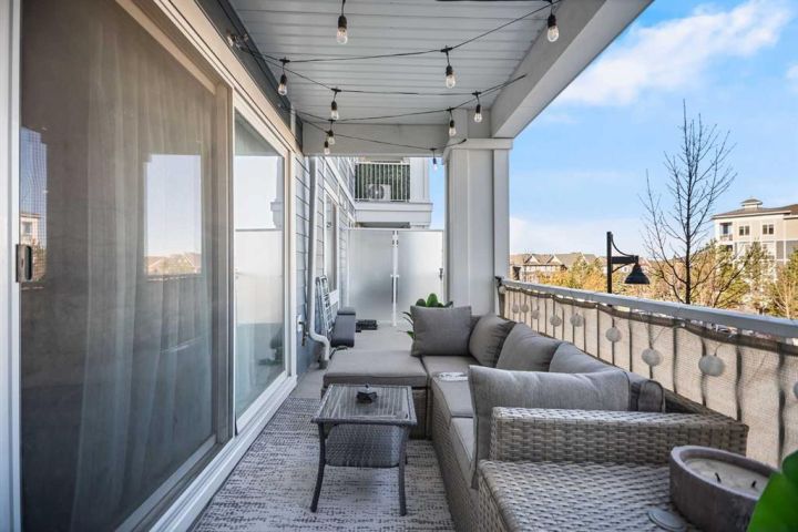 Welcome to Auburn Walk, a thoughtfully designed condo community in one of Calgary’s most loved lake neighbourhoods. This bright and beautifully maintained 2-bedroom, 2-bath home combines modern finishes with a warm, comfortable feel—perfect for those who value both style and everyday practicality. Step inside to a spacious open-concept layout that’s ideal for entertaining or simply enjoying a relaxed evening at home. The kitchen is impressive, featuring crisp white cabinetry, gleaming quartz countertops, stainless steel appliances, a built-in oven and microwave, upgraded range hood, and a generous walk-in pantry. The oversized island offers additional storage, a large double sink, and plenty of space for seating—making it the perfect spot for casual meals or morning coffee. The dining area fits a full-sized table for family dinners or hosting friends, while the adjoining living room is bright and inviting. Large windows flood the space with natural light, and the full-height sliding doors open to one of the largest balconies in the complex. With a gas line for your BBQ and room to lounge or dine al fresco, it’s an ideal extension of your living space—perfect for summer evenings and quiet weekends. The primary bedroom provides a calm retreat with a walk-through closet and a private 4-piece ensuite featuring double sinks, quartz counters, and a glass-enclosed shower. The second bedroom is equally well-sized, located next to another full bathroom with a tub and shower combination. In-suite laundry with additional storage keeps everything tidy and convenient. Practical touches continue with a titled, heated underground parking stall—just an elevator ride away—and a separate storage locker for all the extras. Living in Auburn Bay means you’ll enjoy year-round access to the community’s private lake, clubhouse, beaches, and pathways. With parks, playgrounds, schools, and shopping all close by—not to mention the South Health Campus and Seton amenities just minutes away—everything you need is right at your doorstep. This is modern lake living at its best: a beautiful home, a vibrant community, and a lifestyle you’ll love coming home to.