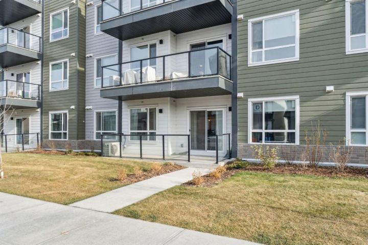 Welcome to Carrington Square - Northwest Calgary’s Premier Condominium Living || Built by CedarGlen Living, five-time winner of the CustomerInsight Builder of Choice Award, this sunny main floor unit offers exceptional quality, thoughtful design, and unbeatable value. || Boasting 1,180.88 sq. ft. RMS (1,262 sq. ft. builder size), this 3-bedroom, 2-bathroom home features a bright open layout with 9’ ceilings, triple-pane Low E windows, and luxury vinyl plank flooring throughout the main living areas. The modern kitchen is a showpiece, complete with engineered stone countertops, full-height cabinetry, subway tile backsplash, stainless steel appliances, and a large island ideal for entertaining. || The spacious living and dining area flow seamlessly onto the west-facing balcony, where you can enjoy your morning coffee and abundant natural light. The primary suite includes a generous walk-in closet and a 4-piece ensuite with dual sinks and an upgraded bank of drawers for added functionality. Two additional bedrooms and a full bathroom are perfectly positioned on the opposite side for privacy. || Additional highlights include in-suite laundry, a Fresh Air System (ERV), air conditioning, and a gas line for your BBQ. This home comes with a titled underground parking stall and a leased storage locker conveniently located on the main floor, not in the parkade. || Carrington Square is a PET-FRIENDLY community with unbeatable proximity to everyday conveniences, just steps from the new No Frills, shops, parks, playgrounds, a skate park, basketball courts, and scenic pathways. With quick access to 14th Street NW and Stoney Trail, commuting anywhere in the city is effortless. || Move-in ready and waiting for you to call it home.