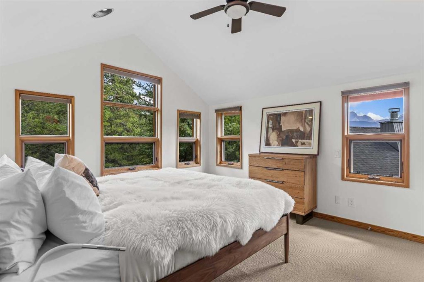 Welcome to the prestigious Silvertip Resort, one of Canmore’s most sought-after neighborhoods, home to a world-class golf course, Fine Dining, the best patio in town overlooking the 18th hole, and the Silvertip Market. This spectacular 5-bedroom plus office home offers 3,222 sq.ft of architecturally thoughtful design, blending sunlight, mountain views, and privacy. The open-concept kitchen, dining, and living space is highlighted by soaring log pillars and a 2-story wood-burning river rock fireplace. Upstairs, the primary retreat features a full ensuite, along with two additional bedrooms and a second full bath. With bedrooms on the main and lower levels, comfort and flexibility are assured. Outdoor living includes a southwest-facing deck, a patio backing onto a natural reserve, and a lower-level patio with hot tub off the family room—perfect for entertaining or quiet relaxation. A true mountain retreat for full-time or vacation living.