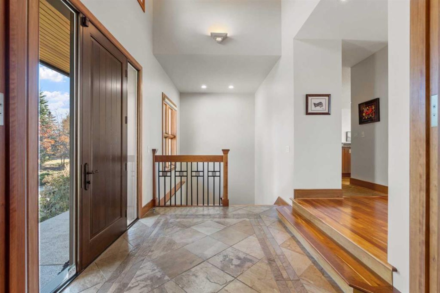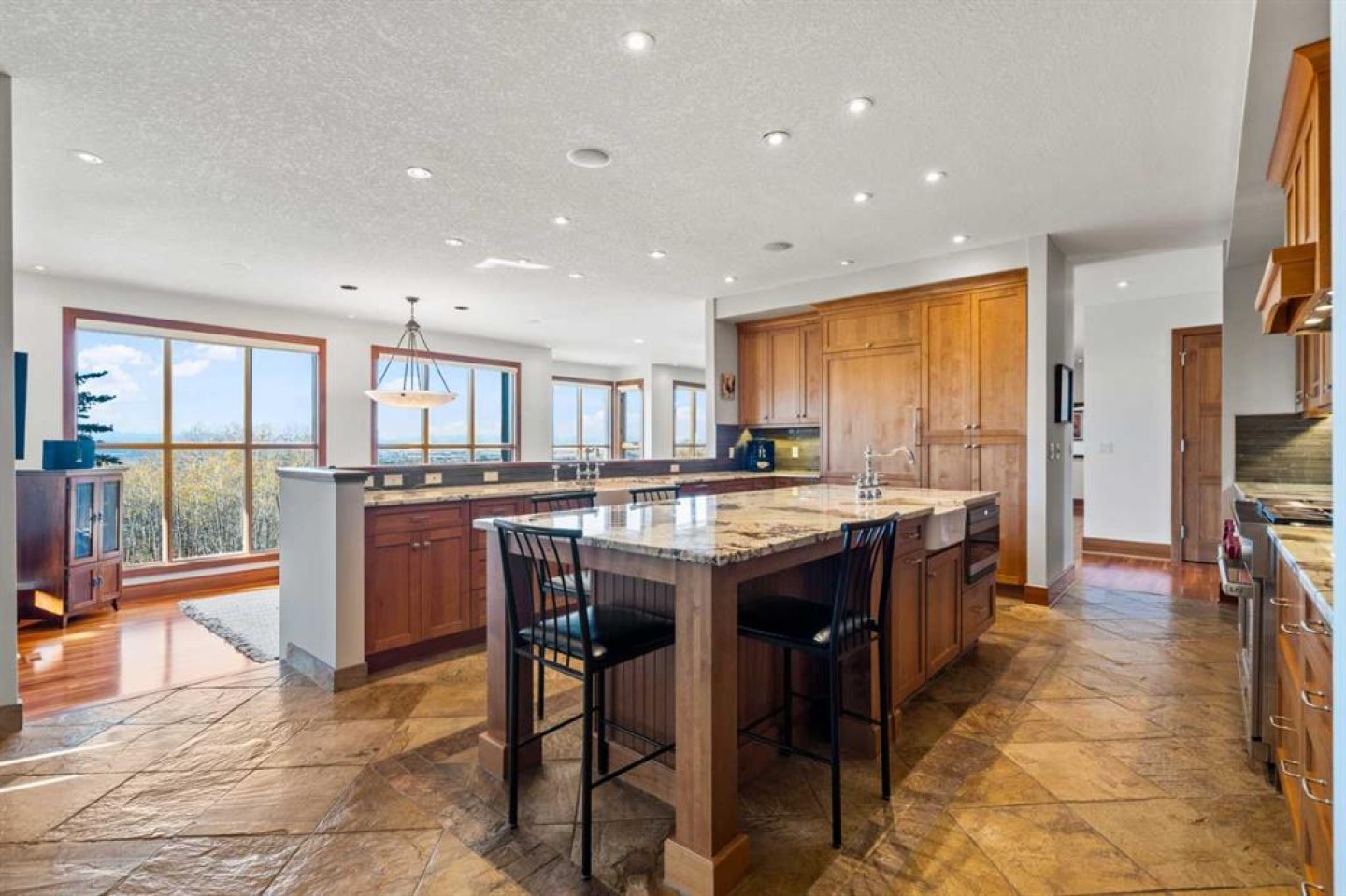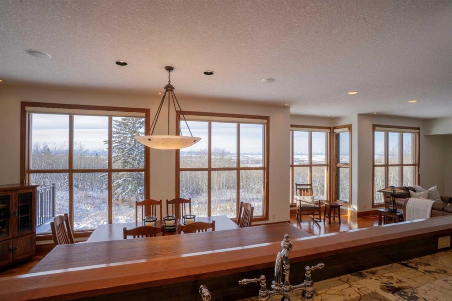 This exceptional, one-of-a-kind property offers the best of Springbank living — privacy, tranquillity, and breathtaking Rocky Mountain views. Set on a picturesque 2.17-acre lot in the heart of Pinnacle Ridge, this walkout bungalow sits high on the ridge, surrounded by beautifully landscaped grounds that provide seclusion from the street and neighbours. Tucked away from main roads, the property features its own private ravine, approximately one acre of mature trees and natural landscape, offering beauty and privacy while minimizing yard maintenance. A circular driveway flanked by mature trees sets the tone from the moment you arrive — this is truly something special. Inside, you’re greeted by stunning mountain vistas and an open layout. The beautifully renovated kitchen features a large island, granite countertops, and high-end appliances, including a Sub-Zero refrigerator, wine fridge, microwave, and 48” Wolf gas range. It opens to a bright dining space and sitting area with access to the large main deck (23' x 22'). The spacious living room, complete with a fireplace, perfectly frames the magnificent mountain backdrop. The main-floor primary suite offers a luxurious six-piece ensuite and a generous walk-in closet. The main level also includes a home office, two powder rooms, a walk-in pantry, and a mudroom that connects to an oversized four-car garage. The 54' x 26' garage (1,279 sq. ft.) is insulated, drywalled, painted, and finished with epoxy flooring, with half the space offering a 12’3” ceiling that is ideal for large trucks or lifts. The walkout lower level features a large recreation room, a wet bar that seats up to ten, a dedicated theatre room, three additional bedrooms, and two full baths. Cherry hardwood and tile flooring flow throughout the home, with wool carpet in the lower-level bedrooms for added comfort. The exterior showcases stucco and stone, complemented by a newer asphalt shingle roof (2020, 50-year warranty). An enclosed under-deck storage room is ideal for garden tools or a ride-on mower. This immaculate property has been meticulously maintained by its current owners, with recent mechanical upgrades including two new furnaces with humidifiers (2019) and two new air-conditioning units (2024). A truly remarkable estate combining privacy, panoramic views, and refined living in one of Springbank’s most sought-after locations.