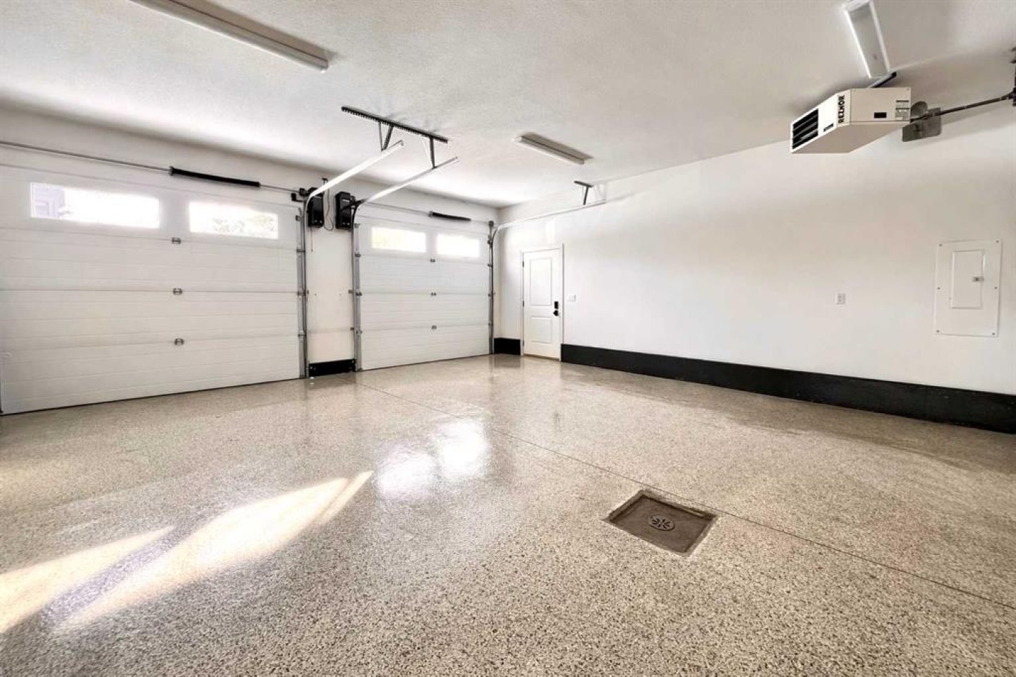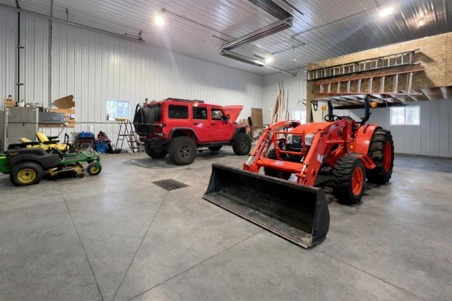 Heated with radiant heat, mezzanine and floor drain - 36'x48' with 8ft and 14ft power overhead doors